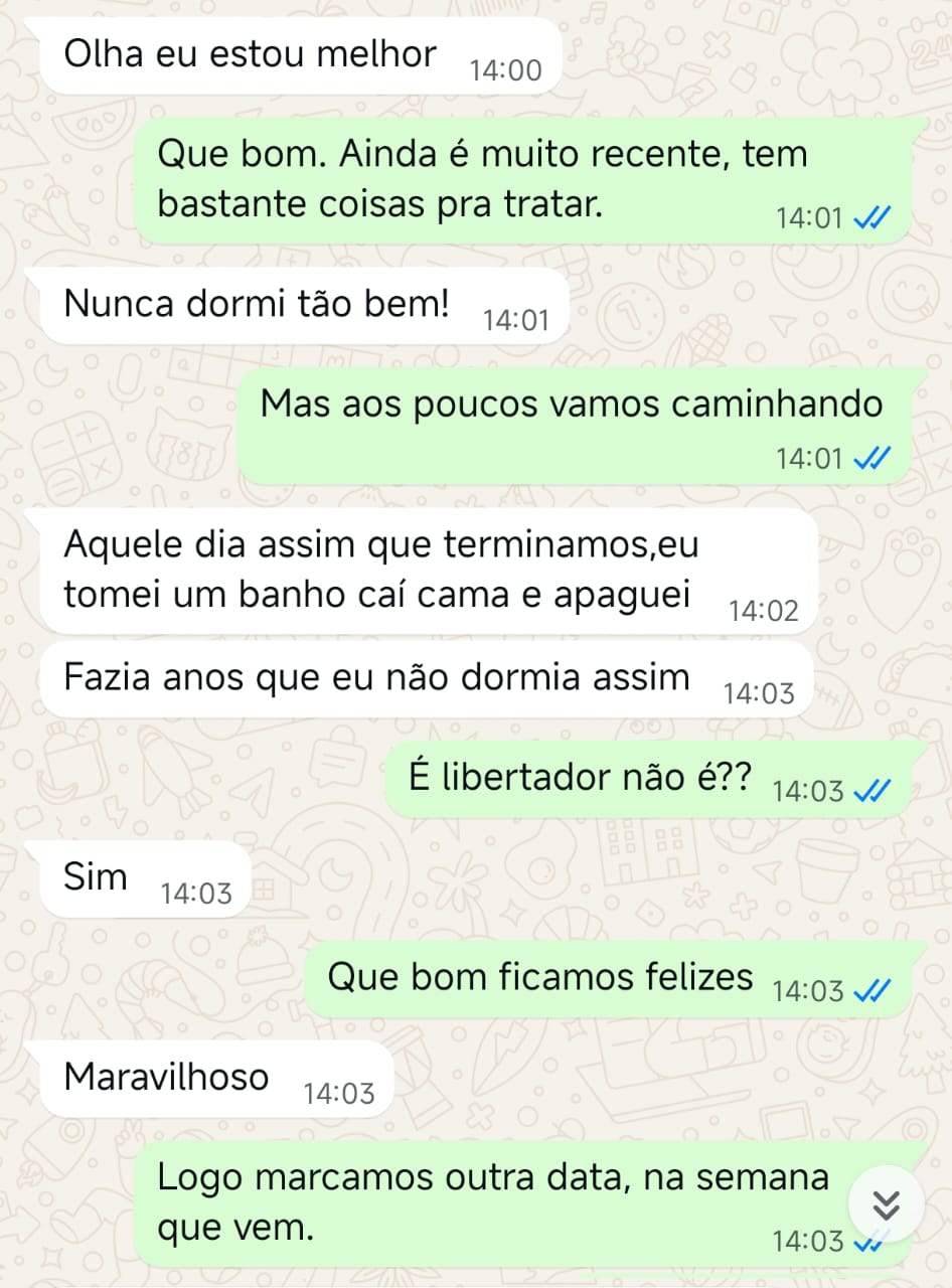 A partir do que for identificado na nossa análise clínica e os resultados da fase preparatória, eu desenharei um caminho de acompanhamento sob medida. O foco aqui é a eficácia: poucas sessões para resolver o que antes parecia impossível. Ao final do nosso encontro, você terá uma nova perspectiva e a rota exata para solucionar seus conflitos de forma IRREVERSÍVEL.